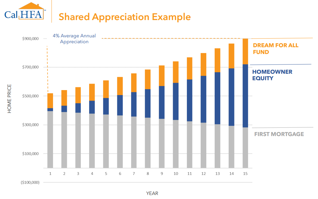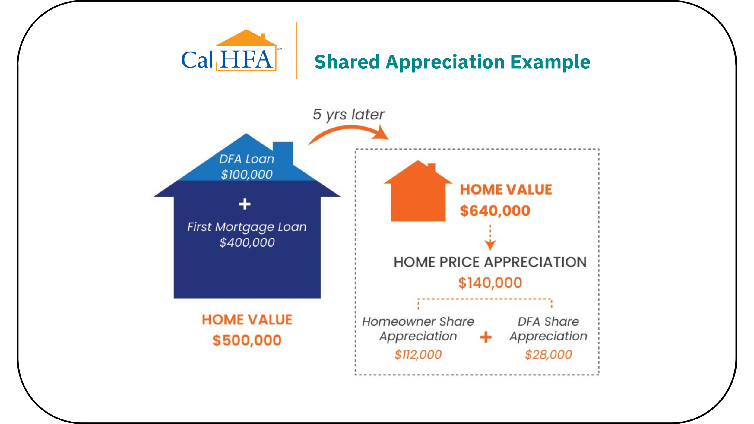 • Shared appreciation (or shared equity) just means that since the California State Housing Finance Agency is investing (partnering) in your ability to purchase a home that will build generational wealth for you, that you will split or share a small percentage of the increase in the value of the home when you sell, transfer ownership, or refinance